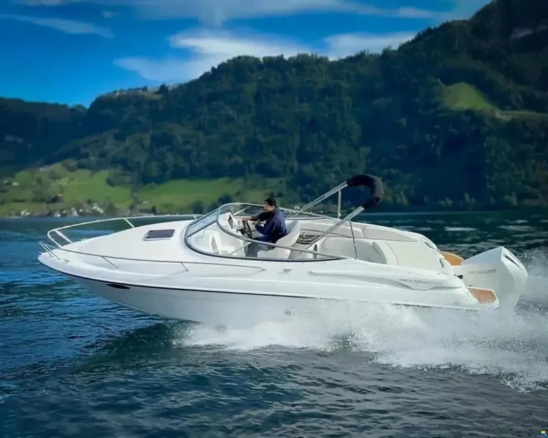 Power comes from a Mercury 4-stroke outboard delivering 225 hp (165 kW). The planing hull reaches speed swiftly, while the bow thruster ensures precise manoeuvring in harbour. Lake Constance (Bodensee) type approval confirms compliance with strict emissions and noise regulations.